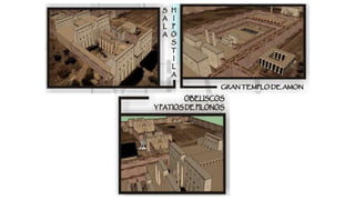 El complejo religioso de Karnak en Egipto se construyó durante más de 2,000 años, convirtiéndose en el centro religioso más importante del Antiguo Egipto. Contenía varios templos dedicados a dioses como Amón, Mut y Jonsu, así como patios, pilares y obeliscos monumentales. Solo el faraón y la élite podían acceder a todas las áreas del complejo, que reflejaba el poder divino de los dioses a través de su arquitectura ordenada y simbólica.
