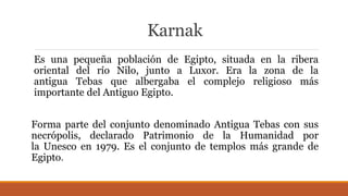 El documento describe la ciudad de Karnak en Egipto. Karnak se encuentra en la ribera oriental del río Nilo cerca de Luxor y albergaba el complejo religioso más importante del antiguo Egipto. El conjunto de templos de Karnak es el más grande de Egipto y fue declarado Patrimonio de la Humanidad. La ciudad estaba protegida por muros de ladrillo de más de 20 metros de alto.