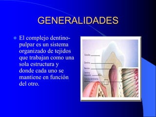 1. El documento describe el complejo dentino-pulpar, que incluye la dentina y la pulpa dental.