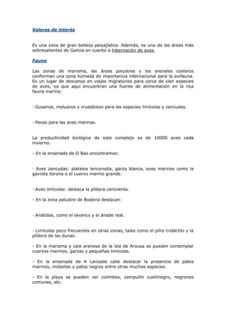 Este documento describe el complejo intermareal de Umia-O Grove, ubicado en el sur de la ría de Arousa en Galicia, España. El área contiene diversos hábitats como playas, marismas y lagunas que albergan una gran diversidad de flora y fauna, incluyendo más de 100 especies de aves migratorias. La zona también contiene varias especies endémicas de plantas.