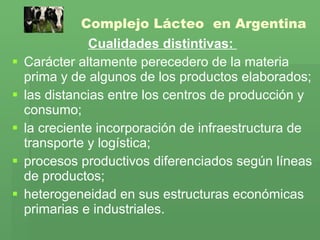 El documento describe las características del complejo lácteo argentino. Explica que está compuesto por tambos, mercados e industrias con heterogeneidades productivas. Las principales provincias lácteas son Buenos Aires, Córdoba, Entre Ríos, La Pampa y Santa Fe. El consumo interno y la demanda de exportaciones aumentaron en las últimas décadas, al igual que las inversiones de empresas multinacionales. Los supermercados e hipermercados reemplazaron a los pequeños comercios minoristas en la comercialización de productos lá
