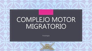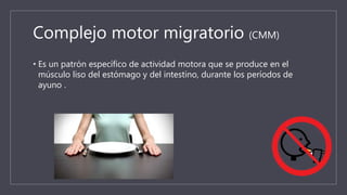 El complejo motor migratorio (CMM) es un patrón de actividad motora en el estómago e intestino durante el ayuno que dura 1.5-2 horas y consta de 4 fases. La motilina se secreta cíclicamente durante el ayuno y estimula las ondas de motilidad que limpian el tracto gastrointestinal y previenen el crecimiento bacteriano. La ingestión de alimentos inhibe la secreción de motilina a través de mecanismos aún desconocidos.