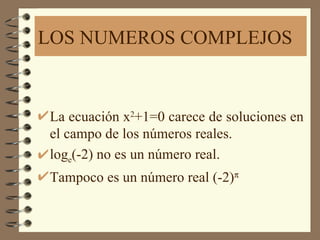 El documento introduce los números complejos, definidos como pares ordenados de números reales. Explica que pueden representarse geométricamente como puntos en el plano cartesiano y que la unidad imaginaria es i=(0,1). Describe las operaciones básicas con números complejos como suma, multiplicación, inverso y exponencial compleja. Finalmente, ilustra algunas propiedades con ejemplos numéricos.