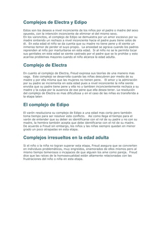 Este documento describe los complejos de Edipo y Electra, que son deseos inconscientes en los niños por el padre o madre del sexo opuesto con la intención de eliminar al del mismo sexo. En los niños, el complejo de Edipo implica amor por la madre y celos del padre, mientras que en las niñas, el complejo de Electra implica envidia por el pene del padre y rechazo de la madre. Resolver estos complejos es importante para el desarrollo psicológico, y dejarlos irresueltos puede causar problemas en la ed