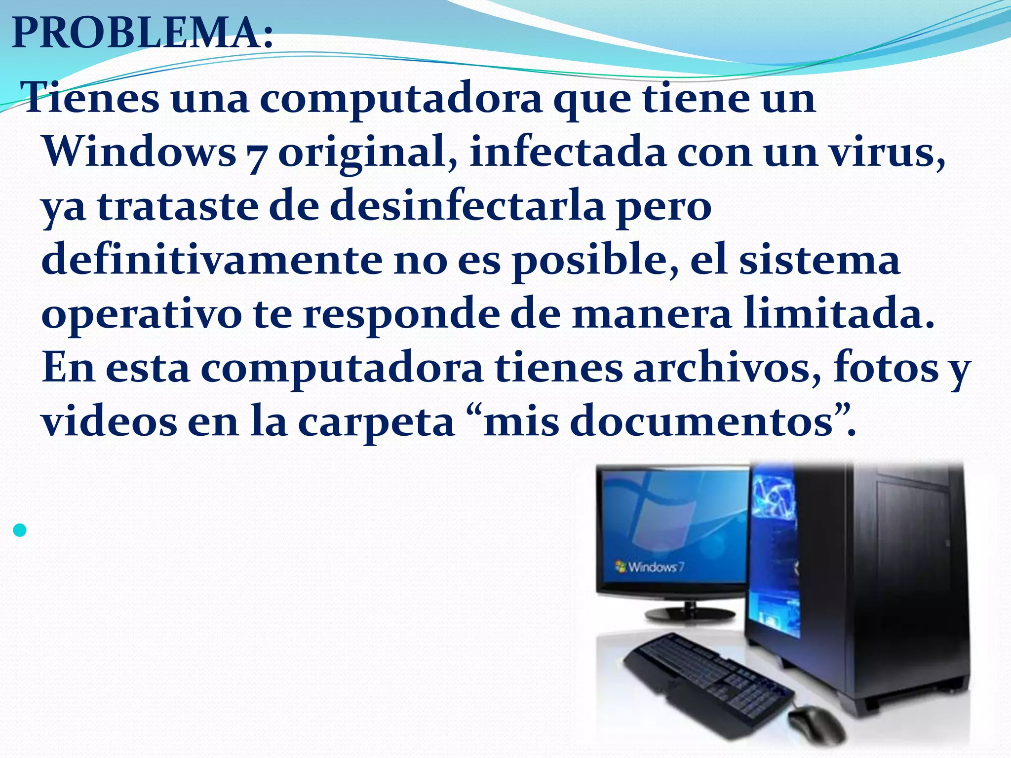 Este documento presenta un problema técnico sobre una computadora infectada con un virus y proporciona instrucciones en 6 pasos para recuperar archivos, reinstalar el sistema operativo original, proteger la computadora con programas antivirus y cortafuegos, e instalar navegadores, lector PDF e impresora.