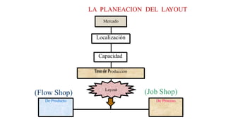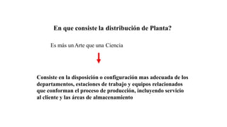 La distribución de planta es un proceso que busca la organización eficiente de departamentos y estaciones de trabajo para optimizar la producción y la satisfacción de los empleados. Se basa en principios como la integración total, la mínima distancia y la flexibilidad, y requiere análisis en casos de nuevas plantas, expansiones o ajustes a disposiciones existentes. Además, plantea preguntas clave para el diseño, garantizando la seguridad y eficiencia en el movimiento de materiales y personal.