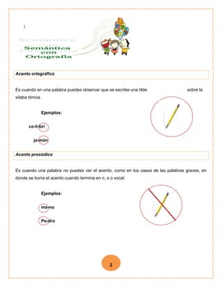 Este documento explica los diferentes tipos de acentos en español, incluyendo el acento ortográfico, prosódico, enfático y diacrítico. El acento ortográfico se refiere a la tilde que se coloca sobre la sílaba tónica de una palabra. El acento prosódico ocurre cuando no se ve el acento debido a las reglas de palabras graves. El acento enfático se usa con tildes en oraciones exclamativas e interrogativas, mientras que el acento diacrítico diferencia palabras con el mismo significado