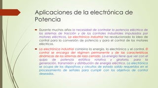 El documento trata sobre las aplicaciones de la electrónica de potencia. Explica que la electrónica industrial combina energía, electrónica y control para aplicaciones como controles de motores, sistemas de tracción y controles industriales. También describe los dispositivos semiconductores de potencia como diodos, tiristores y transistores que se usan en la electrónica de potencia, así como algunas de sus aplicaciones como controles de calefacción, iluminación y motores.