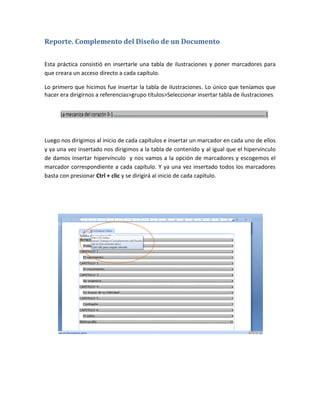 La práctica consistió en insertar una tabla de ilustraciones y marcadores hipervinculos en los capítulos de un documento para proveer acceso directo a cada sección. Primero se insertó la tabla de ilustraciones a través del menú referencias. Luego se añadieron marcadores al inicio de cada capítulo y se vincularon a la tabla de contenido, permitiendo navegar entre las secciones presionando Ctrl + clic en los marcadores.