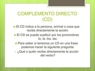 El documento explica la función del complemento directo (CD) e indirecto (CI) en las oraciones, destacando que el CD indica lo que recibe directamente la acción del verbo, mientras que el CI señala a quién beneficia o perjudica dicha acción. Proporciona ejemplos y preguntas clave para identificar ambos tipos de complementos. Se menciona que el CD puede ser reconocido por su capacidad de ser sustituido por pronombres como lo, la, los, las, y que el CI puede ser mencionado con la pregunta sobre quién o qué se beneficia de la acción.