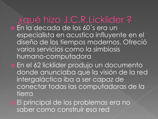 En la década de 1960, Licklider fue un influyente especialista en acústica que ofreció servicios relacionados con la simbiosis humano-computadora. En 1962, Licklider produjo un documento donde anunció su visión de una red intergaláctica que conectaría todas las computadoras de la Tierra, aunque el principal problema era no saber cómo construir esa red.