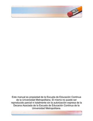 Este documento presenta un repaso para la Prueba de Evaluación y Admisión Universitaria (College Board) en español, incluyendo ejercicios de completar oraciones y seleccionar la palabra o palabras que completen el sentido de cada oración. El documento advierte que no puede ser reproducido sin permiso y fue preparado por profesores de la Universidad Metropolitana para ayudar a los estudiantes a prepararse para el examen.