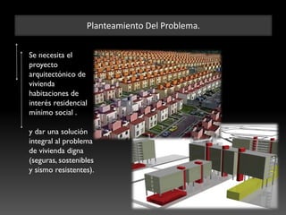 Este documento presenta la composición arquitectónica de una casa de interés residencial mínimo. Describe los integrantes del equipo, el planteamiento del problema de vivienda, las características de la casa y los usuarios. También incluye el programa arquitectónico básico, recursos económicos ilimitados, y análisis de elementos similares como casas visitadas.