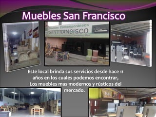 Este local brinda sus servicios desde hace 11 años ofreciendo los muebles más modernos y rústicos del mercado. También brinda sus servicios desde hace 7 años con muebles de arte contemporáneo para convertir tu casa en una obra de arte.