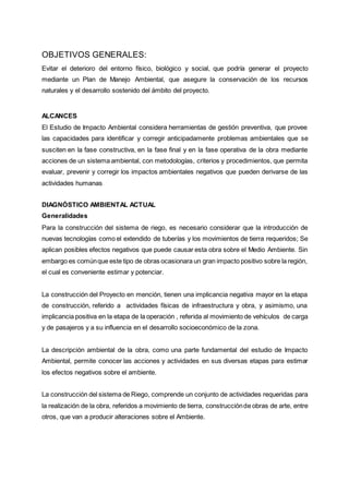 Este documento presenta un informe de impacto ambiental para un proyecto de construcción. Describe los objetivos del estudio, que incluyen identificar, predecir y evaluar los impactos ambientales del proyecto, y proponer medidas para mitigar los impactos negativos. También presenta una metodología para evaluar los impactos que incluye una matriz para identificar y evaluar los posibles impactos durante las distintas fases del proyecto sobre componentes ambientales como el aire, suelo y flora/fauna.