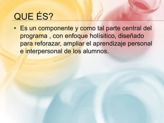 Este documento proporciona información sobre el Componente de Acción, Servicio y Solidaridad (CAS) del Programa del Diploma del IB. Explica que CAS es un componente central que busca reforzar el aprendizaje personal e interpersonal de los estudiantes a través de experiencias en las áreas de creatividad, actividad y servicio. También describe los objetivos de CAS, las etapas del proceso, el rol del coordinador y los recursos internos disponibles para apoyar el programa.