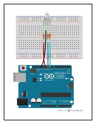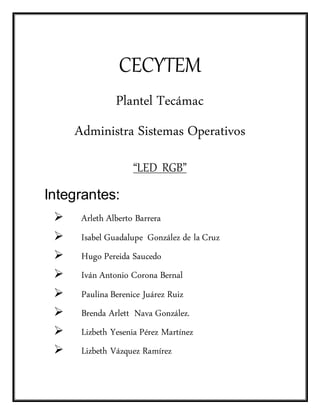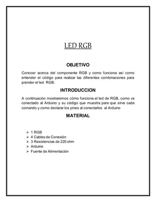 Este documento describe un proyecto realizado por un grupo de estudiantes para aprender sobre el funcionamiento de un LED RGB y cómo controlarlo con Arduino. Explica los materiales utilizados, el código para controlar el LED RGB y cambiar sus colores, y las conclusiones de cada estudiante sobre lo que aprendieron.