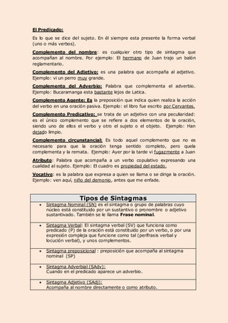 La oración es la unidad básica de la gramática y consiste en una serie de palabras que expresan un significado completo. Las oraciones se clasifican en unimembres, formadas por una o dos palabras, y bimembres, que contienen sujeto y predicado. El sujeto es la persona, animal o cosa de la que se habla, mientras que el predicado expresa lo que se dice sobre el sujeto e incluye el verbo. Las oraciones también pueden contener complementos que aportan más información sobre el sujeto, predicado u otros elementos.