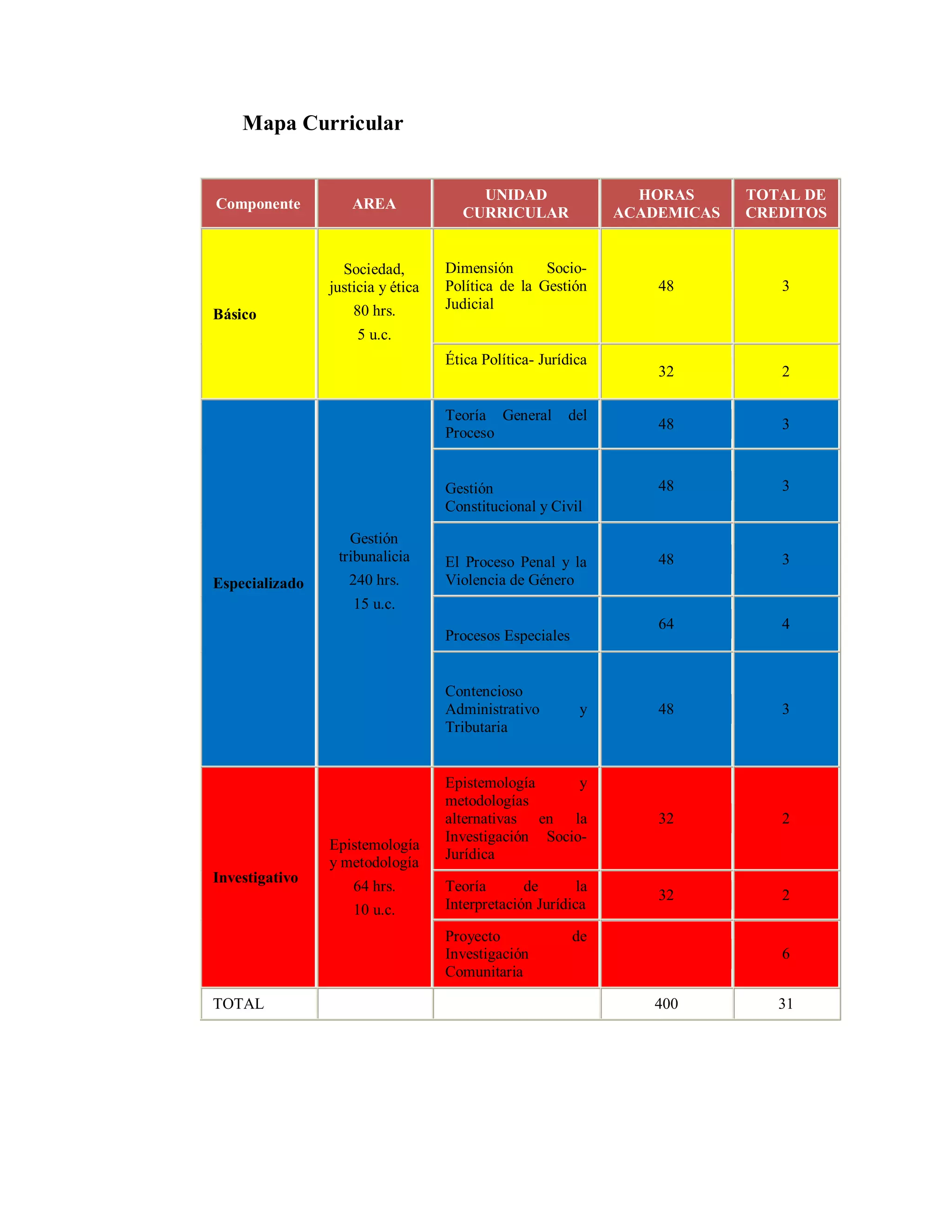 Este documento presenta el mapa curricular de un programa de estudios que consta de 3 componentes: básico, especializado e investigativo. El componente básico cubre 5 unidades curriculares de 80 horas en total y 3 créditos. El componente especializado incluye 6 unidades curriculares de 240 horas y 15 créditos. El componente investigativo comprende 2 unidades curriculares de 64 horas y 10 créditos, incluyendo un proyecto de investigación comunitaria por 6 créditos. En total, el programa requiere 400 horas académicas y 31 crédit
