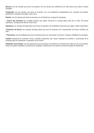El documento describe los componentes principales del balance general de una empresa. El activo incluye los activos corrientes como efectivo, cuentas por cobrar e inventarios, y los activos no corrientes como propiedades, planta y equipo. El pasivo incluye las deudas corrientes como deudas con proveedores y empleados, y las deudas no corrientes como hipotecas. El patrimonio representa la inversión de los accionistas a través del capital y las utilidades acumuladas.