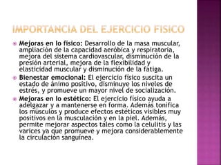 El documento describe los beneficios del ejercicio físico para la salud física, emocional y estética. Realizar actividad física regularmente mejora la circulación, fortalece los músculos y los huesos, reduce el estrés, y ayuda a controlar el peso y la presión arterial. También disminuye los riesgos de padecer enfermedades como problemas cardíacos, diabetes y osteoporosis.