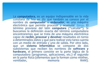 La computadora es un dispositivo esencial en la vida moderna, capaz de procesar y almacenar datos mediante hardware y software. Se compone de varios subsistemas, incluyendo el hardware físico y el software que sirve de interfaz entre el usuario y los componentes. Además, el sistema de redes permite la comunicación entre computadoras a través de Internet, facilitando la transmisión de datos.