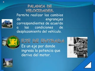 Este documento contiene información sobre varios componentes de una transmisión manual de un vehículo. Explica brevemente engranajes, ejes, sincronizadores y la caja de cambios, y cómo estos elementos trabajan juntos para transmitir la potencia del motor a las ruedas y permitir diferentes velocidades de desplazamiento.