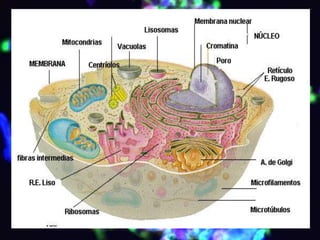 La membrana celular define los límites de la célula y lleva a cabo el intercambio de materiales con el medio extracelular. El citoplasma regula el paso de sustancias a través de la célula. El núcleo almacena la información hereditaria y lleva a cabo la replicación y transcripción del ADN. Los orgánulos como el retículo endoplasmático, los ribosomas, el aparato de Golgi, las mitocondrias y los cloroplastos llevan a cabo funciones específicas
