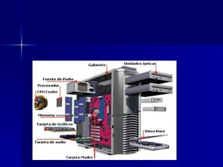 El documento describe los principales componentes de una computadora, incluyendo el gabinete, disco duro, placa base, tarjetas de video y de sonido, memoria RAM y ROM, ventiladores de enfriamiento, microprocesador y fuente de alimentación. Explica brevemente las funciones de cada uno de estos componentes centrales en una computadora.