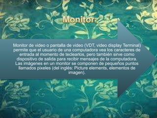 El documento describe los principales componentes de una computadora, incluyendo la carcasa que alberga la tarjeta madre, procesador, memoria y otras tarjetas; el monitor que muestra la salida; el teclado y ratón para la entrada de datos; y la unidad de disco duro para el almacenamiento permanente de gran capacidad. Explica brevemente cómo funcionan estos componentes y sus propósitos.