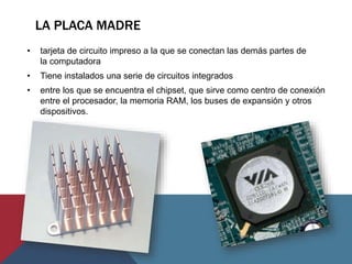 La placa base es la tarjeta de circuito impreso principal de una computadora a la que se conectan todos los componentes. Contiene circuitos integrados como el chipset que conecta el procesador, memoria RAM, buses de expansión y otros dispositivos. Incluye el BIOS que permite funciones básicas como arranque y reconocimiento de hardware para cargar el sistema operativo. La placa base también incluye conectores de alimentación, zócalos para el procesador y memoria RAM, ranuras de expansión y otros componentes.