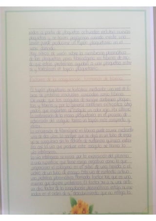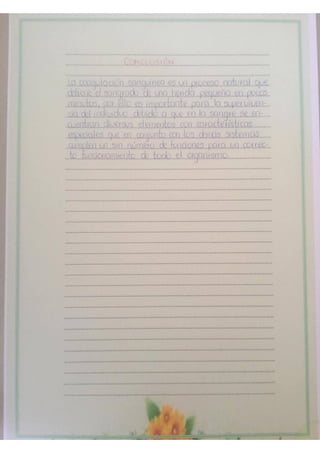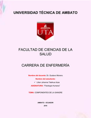 El documento describe los componentes de la sangre en el tema de fisiología humana para una estudiante de enfermería en la Universidad Técnica de Ambato. Se enfoca en los glóbulos rojos, glóbulos blancos y plaquetas que componen la sangre y sus funciones principales como el transporte de oxígeno y dióxido de carbono y la protección contra infecciones.