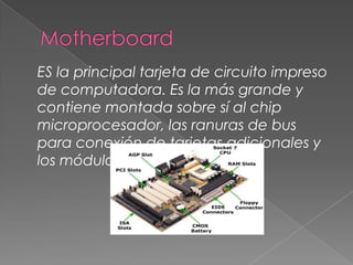 La tarjeta madre contiene el microprocesador, ranuras para tarjetas adicionales y módulos de memoria. Incluye sockets para el microprocesador, chipset, canales DMA, BIOS, interfaces IDE y ATAPI, sockets de memoria y tarjetas de video, buses del sistema, puertos USB, IEEE, serie y paralelo, tarjeta de sonido e interfaz de entrada y salida. La tarjeta de red permite la comunicación de red y el módem convierte señales digitales y analógicas para transmisión de datos a través de