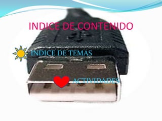 El documento describe los componentes principales de USB. Estos incluyen el controlador, los concentradores (hubs) y los periféricos. También explica que USB es un puerto que permite conectar dispositivos externos a la computadora a través de una interfaz universal serial.