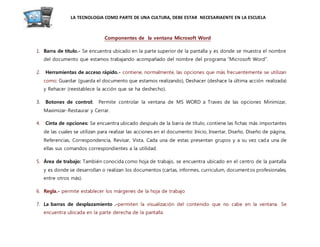 El documento describe los principales componentes de la ventana de Microsoft Word, incluyendo la barra de título, las herramientas de acceso rápido, los botones de control, la cinta de opciones, el área de trabajo, la regla, las barras de desplazamiento, la barra de estado, las opciones de zoom y las vistas del documento. Explica la ubicación y función de cada uno de estos elementos para realizar tareas en documentos de Word como cartas, informes y documentos profesionales.