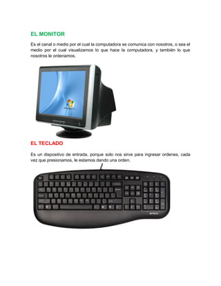 Este documento describe diferentes tipos de dispositivos de computadoras. Explica que los dispositivos de entrada convierten la información en señales eléctricas que se almacenan en la memoria central, los dispositivos de salida reciben información de la computadora para mostrarla o imprimirla, y los dispositivos de procesamiento como la CPU y la memoria ayudan a que la computadora funcione correctamente.