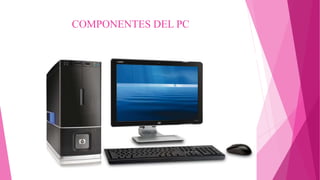 Este documento describe los principales componentes de una computadora. Explica los dispositivos de entrada como el mouse y el teclado, así como los dispositivos de salida como el monitor y las impresoras. También describe los diferentes tipos de dispositivos de almacenamiento como los discos duros, discos flexibles y cintas magnéticas que permiten almacenar datos de forma permanente en la computadora.