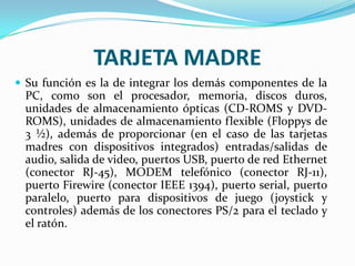 La tarjeta madre integra todos los componentes de la PC como el procesador, memoria, discos duros y unidades de almacenamiento. Proporciona slots para agregar estos componentes así como puertos de entrada/salida. Los principales componentes son el slot del procesador, los conectores IDE para discos duros y unidades ópticas, los slots de memoria, y los slots PCI y AGP para tarjetas de expansión como video. El chipset controla la coordinación entre todos estos componentes.
