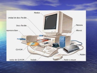 El documento describe los componentes físicos y lógicos de un computador. Los componentes físicos incluyen la unidad central de proceso y periféricos como dispositivos de almacenamiento masivo y de salida. Los componentes lógicos son el software, incluyendo el sistema operativo y programas SIG que almacenan, analizan e información geográfica.