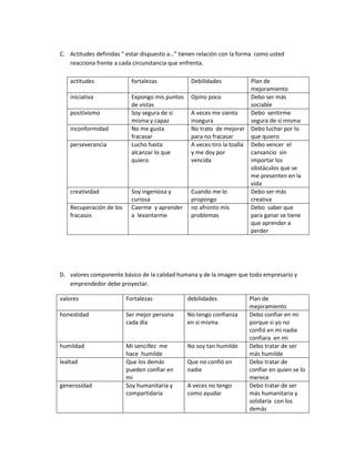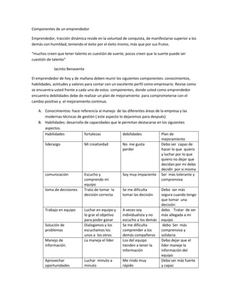 El documento describe los componentes clave que debe reunir un emprendedor exitoso. Estos incluyen conocimientos sobre gestión empresarial, habilidades como el liderazgo, la comunicación y la toma de decisiones, actitudes como la iniciativa, el positivismo y la perseverancia, y valores como la honestidad, la humildad y la responsabilidad. También analiza las fortalezas y debilidades de un emprendedor en cada una de estas áreas e identifica planes para mejorar las debilidades.