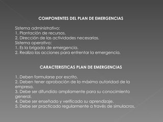 El documento describe los componentes clave de un plan de emergencia, incluyendo identificar riesgos, organizar recursos para enfrentar emergencias, y establecer procedimientos para restablecer condiciones normales. Explica que un plan de emergencias debe estar por escrito, ser aprobado por autoridades, difundido para conocimiento general, enseñado a través de simulacros, y actualizado regularmente. También enumera elementos requeridos como datos generales, planos de evacuación, brigadas de emergencia, y programas de capacitación y simul