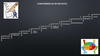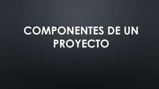 Este documento describe los componentes clave de un proyecto. Estos incluyen la introducción, justificación, objetivos, marco teórico, metodología, análisis de resultados, conclusiones, recomendaciones y anexos. La introducción contextualiza el proyecto, la justificación explica por qué se realizará, los objetivos definen lo que se quiere lograr, y el marco teórico presenta conceptos y antecedentes relevantes. La metodología describe cómo se llevará a cabo el proyecto, mientras que el aná
