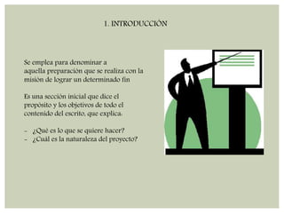 Este documento describe los 10 componentes clave de un proyecto: introducción, justificación, origen, marco teórico, metodología, análisis de resultados, conclusiones, recomendaciones, bibliografía y anexos. Explica brevemente cada sección y los elementos que debe contener, como el propósito del proyecto, los objetivos, las razones para realizarlo, los estudios previos, el método de investigación, la presentación de datos y hallazgos, y la información adicional en anexos.