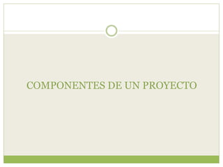 Este documento describe los componentes clave de un proyecto, incluyendo la introducción, justificación, objetivos, marco teórico, metodología, análisis de resultados, conclusiones, recomendaciones, bibliografía y anexos. Explica brevemente el propósito y contenido de cada sección para guiar el desarrollo completo de un proyecto.