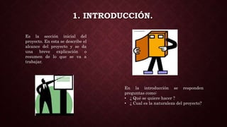 El documento detalla los componentes esenciales de un proyecto, incluyendo la introducción, justificación, objetivos, marco teórico, metodología, análisis de resultados, conclusiones, recomendaciones, bibliografía y anexos. Cada sección aborda aspectos clave como el alcance del proyecto, sus beneficios, los pasos a seguir y cómo se presentarán los datos. Se enfatiza la importancia de un marco teórico sólido y la correcta referencia de fuentes para respaldar el trabajo.