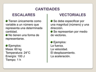 El documento describe las diferencias entre cantidades escalares y vectoriales. Las cantidades escalares solo tienen una magnitud numérica, mientras que las vectoriales requieren especificar tanto una magnitud como una dirección. Un vector es una flecha orientada que se usa para representar gráficamente cantidades vectoriales, con elementos como magnitud, dirección y componentes proyectadas sobre ejes.