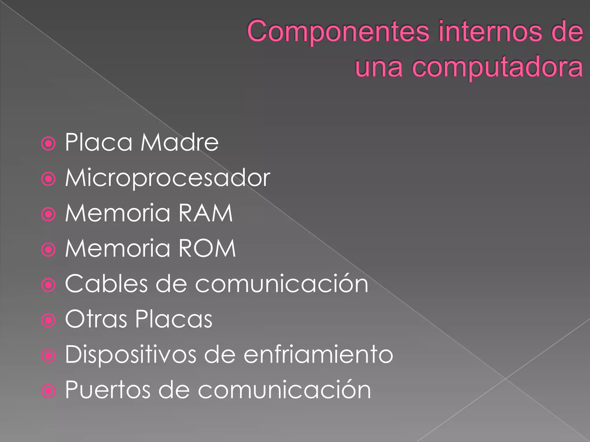 Los principales componentes internos de una computadora incluyen la placa madre, el microprocesador, la memoria RAM y ROM, los cables de comunicación y los dispositivos de enfriamiento. La placa madre conecta todos los componentes, el microprocesador es el circuito central, la RAM almacena instrucciones y resultados temporales, y la ROM almacena información de forma permanente. Los discos duros y ópticos son los principales dispositivos de almacenamiento externos junto con las unidades de disquetes.