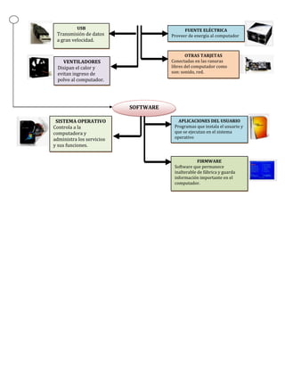 COMPONENTES INDISPENSABLES PARAEL FUNCIONAMIENTO DEL COMPUTADOR<br />TECLADO Ingreso de texto y datos numéricos al computadorPLACA MADREPanel de circuitosMOUSEEnviar comandos, mover puntero en interfaces graficas, señalar, arrastrar.MEMORIA RAM: Almacena información.ROM: Almacena la Bios y la configuración básica del computador.MONITORMuestra las tareas que se llevan a cabo en el computadorDISCO DURO Disco rígido y magnetizado localizado dentro del chasis.IMPRESORA Produce en papel u otros medios una copia de lo que se muestra en la pantallaDISCOS ÓPTICOS Almacenan información y estos pueden ser: Cd-R, CD-RW, DVD-R, etc.MEMORY FLASH Dispositivo portable.Leer – escribir información. PARLANTESPermite escuchar sonidos emitidos por el computadorHARDWARE<br />-451485250825<br />5454015410273554540155721985558736548647355587365339788555873652635885501586518548355358765831855130165940435<br />-680085227965<br />MICROPROCESADOR Cerebro del computador<br />JOYSTICControla juegos de la computadora <br />-5657850<br />WEBCAM Entrada de video especialmente para videoconferencias.<br />-58483515240<br />ESCÁNER Digitaliza documentos u objetos.<br />-546735201930<br />-58674041275<br />5589097-412907FUENTE ELÉCTRICA Proveer de energía al computador-301064-412907USB Transmisión de datos a gran velocidad. <br />5452745250190OTRAS TARJETASConectadas en las ranuras libres del computador como son: sonido, red.-336690250479<br />VENTILADORESDisipan el calor y evitan ingreso de polvo al computador.<br />SOFTWARE<br />569058916732APLICACIONES DEL USUARIO Programas que instala el usuario y que se ejecutan en el sistema operativo -625150101792SISTEMA OPERATIVOControla a la computadora y administra los servicios y sus funciones. <br />5690589209181FIRMWARE Software que permanece inalterable de fábrica y guarda información importante en el computador. <br />