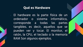 Este documento describe los principales componentes de un computador. Explica que el hardware son las partes físicas como el monitor, teclado, CPU, mientras que el software son programas como Word, Excel y sistemas operativos. Luego detalla los dispositivos de entrada como teclado y mouse, y de salida como monitores e impresoras. También habla de la unidad central de procesamiento, memoria RAM y tarjeta madre como componentes de procesamiento, y discos y USB como unidades de almacenamiento. Finalmente, diferencia entre aplicaciones, sistem