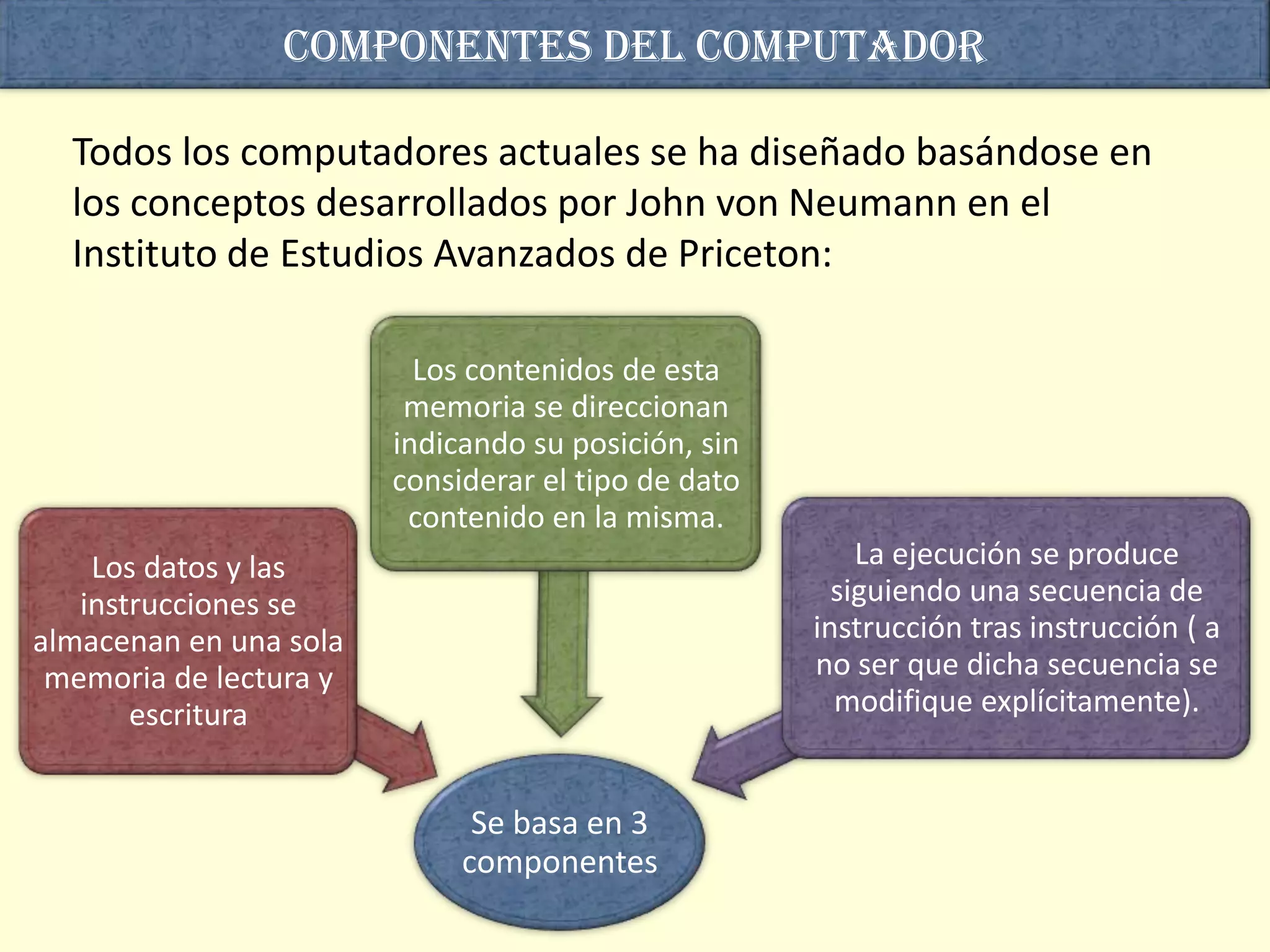 El documento describe los principales componentes de un computador y cómo interactúan. Los componentes clave son la unidad central de procesamiento (CPU), la memoria principal y los módulos de entrada y salida (E/S). La CPU ejecuta instrucciones almacenadas en la memoria siguiendo un ciclo de captación y ejecución. La memoria almacena tanto las instrucciones como los datos, e intercambia información con la CPU y los módulos E/S. Juntos, estos componentes permiten que el computador ejecute programas de forma sec